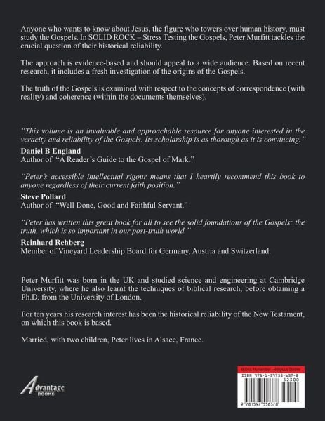 Anyone who wants to know about Jesus, the figure who towers over human history, must study the Gospels. In SOLID ROCK - Stress Testing the Gospels, Peter Murfitt tackles the crucial question of their historical reliability. The approach is evidence-based and should appeal to a wide audience. Based on recent research, it includes a fresh investigation of the origins of the Gospels. The truth of the Gospels is examined with respect to the concepts of correspondence (with reality) and coherence (within the documents themselves).