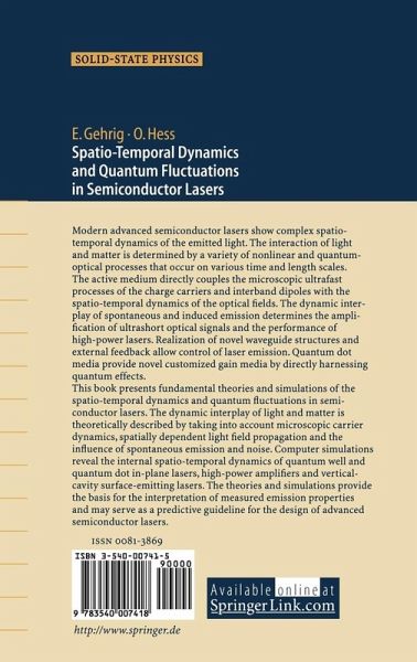 Modern advanced semiconductor lasers show complex spatio-temporal dynamics of the emitted optical fields. This book presents fundamental theories and simulations of the spatio-temporal dynamics and quantum fluctuations in semiconductor lasers. The dynamic interplay of light and matter is theoretically described by taking into account microscopic carrier dynamics, spatially dependent light-field propagation and the influence of spontaneous emission and noise. Microscopic simulations reveal the internal spatio-temporal dynamics of in-plane lasers, high-power amplifiers and vertical-cavity surfac...
