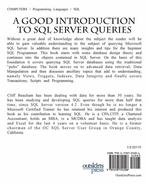 A good introduction to SQL Server Queries. Without a great deal of knowledge about the subject the reader will be able to gain valuable understanding to the subject of querying Microsoft SQL Server. In addition there are many insights and tips for the beginner SQL Programmer. This book starts with some database design theory and continues into the objects contained in SQL Server. On the basis of this foundation it covers querying SQL Server databases using the traditional "pubs" database. The book moves on to advanced data retrieval, Data Manipulation and then discusses ancillary topics that add to understanding, namely Views, Triggers, Indexes, Data Integrity and finally covers Transactions, Scripts and Programming.