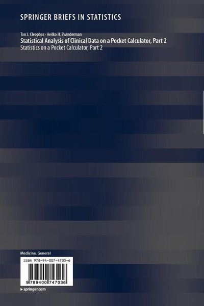 Both part 1 and 2 of this title consist of a minimum of text and this will enhance the process of mastering the methods. Yet the authors recommend that for a better understanding of the test procedures the books be used together with the same authors' textbook "Statistics Applied to Clinical Studies" 5th edition edited 2012, by Springer Dordrecht Netherlands. More complex data files like data files with multiple treatment modalities or multiple predictor variables can not be analyzed with a pocket calculator. We recommend that the small books "SPSS for starters", Part 1 and 2 (Springer, Dordrecht, 2010, and 2012) from the same authors be used as a complementary help for the readers' benefit.