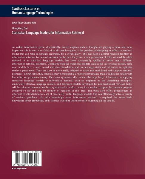 As online information grows dramatically, search engines such as Google are playing a more and more important role in our lives. Critical to all search engines is the problem of designing an effective retrieval model that can rank documents accurately for a given query. This has been a central research problem in information retrieval for several decades. In the past ten years, a new generation of retrieval models, often referred to as statistical language models, has been successfully applied to solve many different information retrieval problems. Compared with the traditional models such as the vector space model, these new models have a more sound statistical foundation and can leverage statistical estimation to optimize retrieval parameters. They can also be more easily adapted to model non-traditional and complex retrieval problems. Empirically, they tend to achieve comparable or better performance than a traditional model with less effort on parameter tuning. This book systematically reviews the large body of literature on applying statistical language models to information retrieval with an emphasis on the underlying principles, empirically effective language models, and language models developed for non-traditional retrieval tasks. All the relevant literature has been synthesized to make it easy for a reader to digest the research progress achieved so far and see the frontier of research in this area. The book also offers practitioners an informative introduction to a set of practically useful language models that can effectively solve a variety of retrieval problems. No prior knowledge about information retrieval is required, but some basic knowledge about probability and statistics would be useful for fully digesting all the details. Table of Contents: Introduction / Overview of Information Retrieval Models / Simple Query Likelihood Retrieval Model / Complex Query Likelihood Model / Probabilistic Distance Retrieval Model / Language Models for Special Retrieval Tasks / Language Models for Latent Topic Analysis / Conclusions