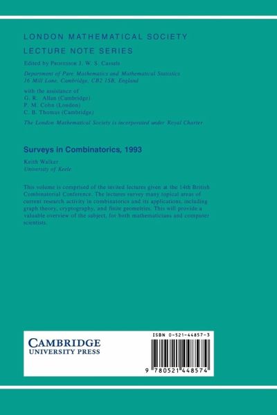 1. Restricted colourings of graphs N. Alon; 2. Polynomials in finite geometries and combinatorics A. Blokhuis; 3. Models of random partial orders G. Brightwell; 4. Applications of sub-modular functions A. Frank; 5. Weighted quasigroups A. J. W. Hilton; 6. 2-transitive graphs with projective sub-constituents A. A. Ivanov; 7. On circuit covers, circuit decompositions and Euler tours of graphs B. Jackson; 8. Slicing the hypercube M. Saks; 9. Combinatorial designs and cryptography D. R. Stinson.