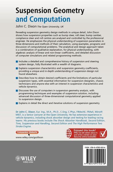 Revealing suspension geometry design methods in unique detail, John Dixon shows how suspension properties such as bump steer, roll steer, bump camber, compliance steer and roll centres are analysed and controlled by the professional engineer. He emphasizes the physical understanding of suspension parameters in three dimensions and methods of their calculation, using examples, programs and discussion of computational problems. The analytical and design approach taken is a combination of qualitative explanation, for physical understanding, with algebraic analysis of linear and non-linear coefficients, and detailed discussion of computer simulations and related programming methods.