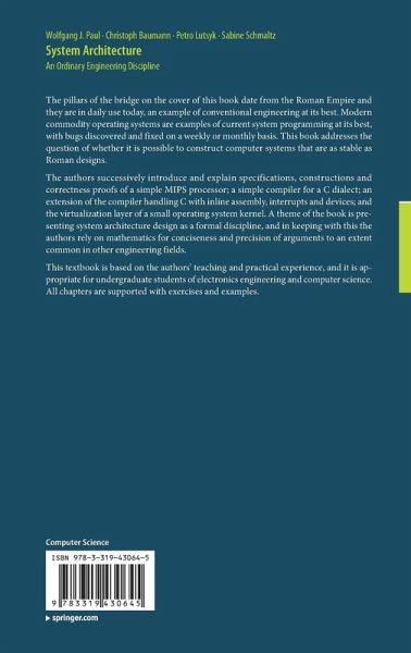 The authors successively introduce and explain specifications, constructions and correctness proofs of a simple MIPS processor; a simple compiler for a C dialect; an extension of the compiler handling C with inline assembly, interrupts and devices; and the virtualization layer of a small operating system kernel. A theme of the book is presenting system architecture design as a formal discipline, and in keeping with this the authors rely on mathematics for conciseness and precision of arguments to an extent common in other engineering fields.