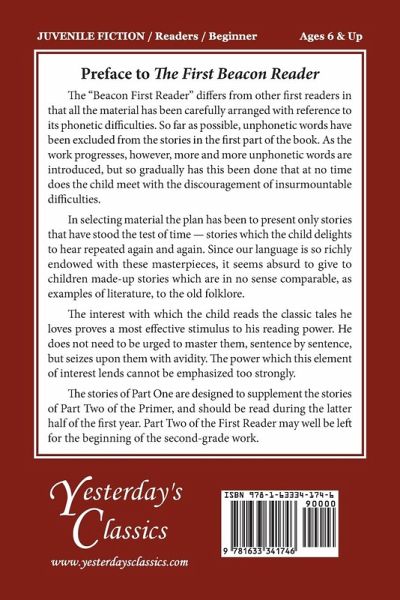 The "Beacon First Reader" differs from other first readers in that all the material has been carefully arranged with reference to its phonetic difficulties. In selecting material the plan has been to present only stories that have stood the test of time, stories which the child delights to hear repeated again and again. Since our language is so richly endowed with these masterpieces, it seems absurd to give to children made-up stories which are in no sense comparable, as examples of literature, to the old folklore. The interest with which the child reads the classic tales he loves proves a mos...