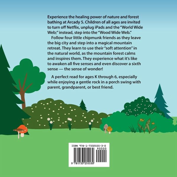 Experience the healing power of nature and forest bathing at Arcady 5. Children of all ages are invited to turn off Netflix, unplug iPads and the "World Wide Web;" instead, step into the "Wood Wide Web." Follow four little chipmunk friends as they leave the big city and step into a magical mountain retreat. They learn to use their "soft attention" in the natural world, as the mountain forest calms and inspires them. They experience what it's like to awaken all five senses and even discover a sixth sense - the sense of wonder! A perfect read for ages K through 6, especially while enjoying a gen...