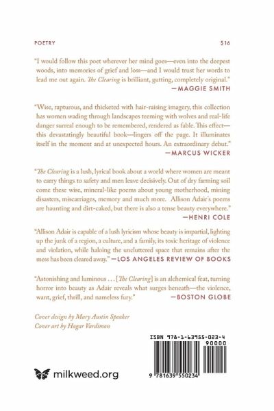 Winner of the 2020 Max Ritvo Poetry Prize, The Clearing navigates the ever-shifting poles of violence and vulnerability with rich imagination and a singular incisiveness, "asserting feminist viewpoints and mortal terror in lush musical lines" (New York Times). The women in Allison Adair's debut collection-luminous and electric from the first line to the last-live in places that have been excavated for gold and precious ores. They understand the nature of being hollowed out, of being "the planet's stone / core as it tries to carve out one secret place and fails." And so, as these poems take us from the midst of the Civil War to our current era, they chart fairy tales that are at once unsettling and painfully familiar, never forgetting that cruelty compels us to search for tenderness. "What if this time," they ask, "instead of crumbs the girl drops / teeth, her own, what else does she have." Adair sees the dirt beneath our nails, both alone and as a country, and pries it gently loose until we remember something of who we are, "from before . . . from a similar injury or kiss." There is a dark tension in this work, and its product is wholly "an alchemical feat, turning horror into beauty" (Boston Globe).