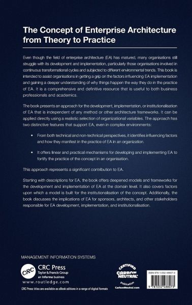 The implementation and practice of enterprise architecture (EA) have been slow and challenging, despite growing popularity and interest from all sectors. The book demonstrates how the challenges can be addressed through practice and institutionalization of EA, to foster organizational capabilities, sustainability, and competitiveness.