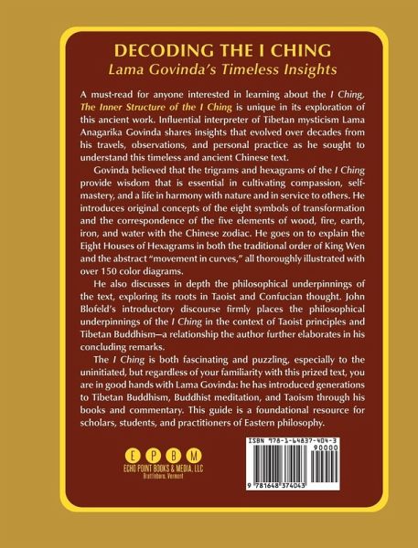 Decoding the I Ching: Lama Govinda's Timeless Insights A must-read for anyone interested in learning about the I Ching, The Inner Structure of the I Ching is unique in its exploration of this ancient work. Influential interpreter of Tibetan mysticism Lama Anagarika Govinda shares insights that evolved over decades from his travels, observations, and personal practice as he sought to understand this timeless and ancient Chinese text. Govinda believed that the trigrams and hexagrams of the I Ching provide wisdom that is essential in cultivating compassion, self-mastery, and a life in harmony with nature and in service to others. He introduces original concepts of the eight symbols of transformation and the correspondence of the five elements of wood, fire, earth, iron, and water with the Chinese zodiac. He goes on to explain the Eight Houses of Hexagrams in both the traditional order of King Wen and the abstract "movement in curves," all thoroughly illustrated with over 150 color diagrams. He also discusses in depth the philosophical underpinnings of the text, exploring its roots in Taoist and Confucian thought. John Blofeld's introductory discourse firmly places the philosophical underpinnings of the I Ching in the context of Taoist principles and Tibetan Buddhism-a relationship the author further elaborates in his concluding remarks. The I Ching is both fascinating and puzzling, especially to the uninitiated, but regardless of your familiarity with this prized text, you are in good hands with Lama Govinda: he has introduced generations to Tibetan Buddhism, Buddhist meditation, and Taoism through his books and commentary. This guide is a foundational resource for scholars, students, and practitioners of Eastern philosophy. This book is also available from Echo Point Books as a paperback (ISBN 1648374050).