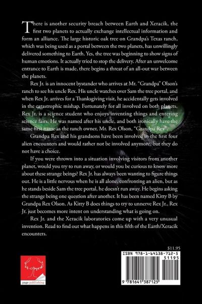 There is another security breach between Earth and Xeracik, the first two planets to actually exchange intellectual information and form an alliance. The large historic oak tree on Grandpa's Texas ranch, which was being used as a portal between the two planets, has unwillingly delivered something to Earth. Yes, the tree was beginning to show signs of human emotions. It actually tried to stop the delivery. After an unwelcome entrance to Earth is made, there begins a threat of an all-out war between the planets. Rex Jr. is an innocent bystander who arrives at Mr. "Grandpa" Olson's ranch to see his uncle Rex. His uncle watches over Sam the tree portal, and when Rex Jr. arrives for a Thanksgiving visit, he accidentally gets involved in the catastrophic mishap. Fortunately for all involved on both planets, Rex Jr. is a science student who enjoys inventing things and entering science fairs. He was named after his uncle, and both ironically have the same first name as the ranch owner, Mr. Rex Olson, "Grandpa Rex". Grandpa Rex and his grandsons have been involved in the first four alien encounters and would rather not be involved anymore, but they do not have a choice. If you were thrown into a situation involving visitors from another planet, would you try to run away, or would you be curious to know more about these strange beings? Rex Jr. has always been wanting to figure things out. He is a little nervous when he is all alone, confronting an alien, but as he stands beside Sam the tree portal, he doesn't run away. He begins asking the strange being one question after another. It has been named Kitty B by Grandpa Rex Olson. As Kitty B does things to try to unnerve Rex Jr., Rex Jr. just becomes more intent on understanding what is going on. Rex Jr. and the Xeracik laboratories come up with a very unusual invention. Read to find out what happens in this fifth of the Earth/Xeracik encounters.