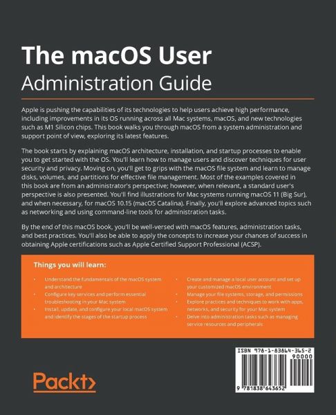 Explore macOS tools and architecture for executing support tasks and system administration, and prepare for the Apple Certified Support Professional (ACSP) certification exam Key FeaturesDelve into macOS Big Sur, from installation to managing apps and optimizing your environment Become an Apple Certified Support Professional (ACSP) with this comprehensive macOS support guide The book is not intended to be a user guide, it covers concepts pertinent for a user acting as an administrator Book Description Apple is pushing the capabilities of its technologies to help users achieve high performance, including improvements in its OS running across all Mac systems, macOS, and new technologies such as M1 Silicon chips. This book walks you through macOS from a system administration and support point of view, exploring its latest features. The book starts by explaining macOS architecture, installation, and startup processes to enable you to get started with the OS. You'll learn how to manage users and discover techniques for user security and privacy. Moving on, you'll get to grips with the macOS file system and learn to manage disks, volumes, and partitions for effective file management. Most of the examples covered in this book are from an administrator's perspective; however, when relevant, a standard user's perspective is also presented. You'll find illustrations for Mac systems running macOS 11 (Big Sur), and when necessary, for macOS 10.15 (macOS Catalina). Finally, you'll explore advanced topics such as networking and using command-line tools for administration tasks. By the end of this macOS book, you'll be well-versed with macOS features, administration tasks, and best practices. You'll also be able to apply the concepts to increase your chances of success in obtaining Apple certifications such as Apple Certified Support Professional (ACSP). What you will LearnUnderstand the fundamentals of the macOS system and architecture Configure key services and perform essential troubleshooting in your Mac system Install, update, and configure your local macOS system and identify the stages of the startup process Create and manage a local user account and set up your customized macOS environment Manage your file systems, storage, and permissions Explore practices and techniques to work with apps, networks, and security for your Mac system Delve into administration tasks such as managing service resources and peripherals Who this book is for ¿If you are a Mac system administrator, support and help desk technician or engineer, or Mac power user looking to explore macOS architecture and tooling, then this book is for you. The book assumes beginner-level knowledge of the macOS environment and system administration.