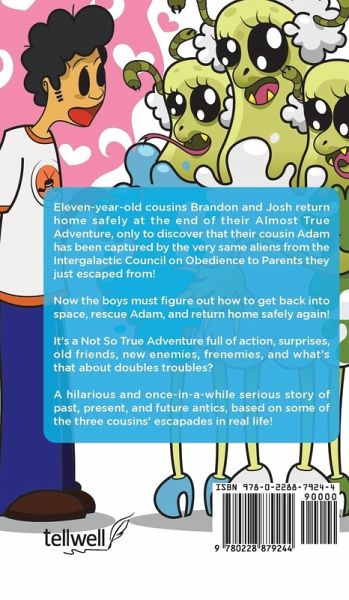 Eleven-year-old cousins Brandon and Josh return home safely at the end of their Almost True Adventure, only to discover that their cousin Adam has been captured by the very same aliens from the Intergalactic Council on Obedience to Parents they just escaped from! Now the boys must figure out how to get back into space, rescue Adam, and return home safely again! It's a Not So True Adventure full of action, surprises, old friends, new enemies, frenemies, and what's that about doubles troubles? A hilarious and once-in-a-while serious story of past, present, and future antics, based on some of the three cousins' escapades in real life!