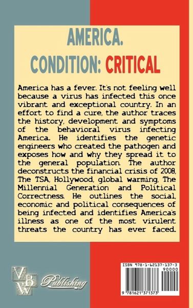America has a fever. It's not feeling well because a virus has infected this once vibrant and exceptional country. In an effort to find a cure, the author traces the history, development and symptoms of the behavioral virus infecting America. He identifies the genetic engineers who created the pathogen and exposes how and why they spread it to the general population. The author deconstructs the financial crisis of 2008, the TSA, Hollywood, global warming, the Millennial Generation and Political Correctness. He outlines the social, economic and political consequences of being infected and ident...