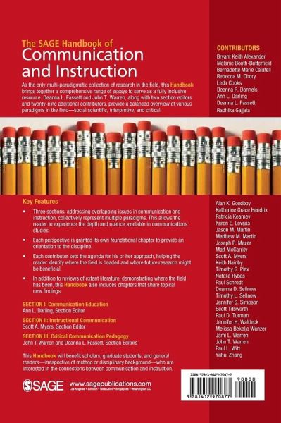 As the only multi-paradigmatic collection of research in the field, this Handbook brings together a comprehensive range of essays to serve as a fully inclusive resource. Deanna L. Fassett and John T. Warren, along with two section editors and twenty-nine additional contributors, provide a balanced overview of various paradigms in the field-social scientific, interpretive, and critical. Key Features Three sections, addressing overlapping issues in communication and instruction, collectively represent multiple paradigms. This allows the reader to experience the depth and nuance available in communications studies. Each perspective is granted its own foundational chapter to provide an orientation to the discipline. Each contributor sets the agenda for their approach, helping the reader identify where the field is headed and where future research might be beneficial. Besides reviews of extant literature, demonstrating where the field has been, this Handbook also includes chapters that share topical new findings.