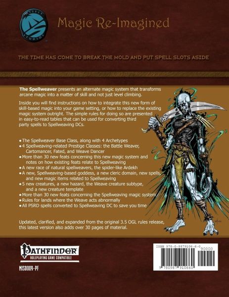 This version is for distribution. The Spellweaver presents an alternate, skill-based magic system that transforms arcane magic into something more than just level climbing. Includes: - Instructions for integrating spellweaving into your game - Spellweaver Base Class & 4 Archetypes - 4 Prestige Classes: the Battle Weaver, Cartomancer, Fated, and Weave Dancer - 30+ new feats concerning this new magic system and notes on how existing feats relate to Spellweaving - A new race of natural spellweavers, the spider-like Ardekh - A new, Spellweaving-based goddess, a new cleric domain, new spells, and n...
