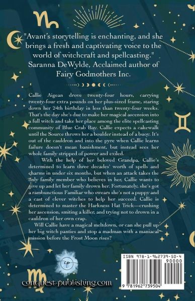 Callie Aigean drove twenty-four hours, carrying twenty-four extra pounds on her plus-sized frame, staring down her 24th birthday in less than twenty-four weeks. That's the day she's due to make her magical ascension into a full witch and take her place among the elite spellcasting community of Blue Crab Bay. Callie expects a cakewalk until the Source throws her a boulder instead of a buoy. It's out of the cauldron and into the pyre when Callie learns failure doesn't mean banishment, but instead sees her whole family stripped of power and exiled. With the help of her beloved Grandpa, Callie's determined to learn three decades' worth of spells and charms in under six months, but when an attack takes the only family member who believes in her, Callie wants to give up and let her family drown her. Fortunately, she's got a rambunctious Familiar who swears she's not a puppy and a cast of clever witches to help her succeed. Callie is determined to master the Harkness Hat Trick--crushing her ascension, smiting a killer, and trying not to drown in a cauldron of her own crap. Will Callie have a magical meltdown, or can she pull up her big witch panties and stop a madman with a maniacal mission before the Frost Moon rises?