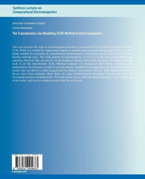This book presents the topic in electromagnetics known as Transmission-Line Modeling or Matrix method-TLM. While it is written for engineering students at graduate and advanced undergraduate levels, it is also highly suitable for specialists in computational electromagnetics working in industry, who wish to become familiar with the topic. The main method of implementation of TLM is via the time-domain differential equations, however, this can also be via the frequency-domain differential equations. The emphasis in this book is on the time-domain TLM. Physical concepts are emphasized here before embarking onto mathematical development in order to provide simple, straightforward suggestions for the development of models that can then be readily programmed for further computations. Sections with strong mathematical flavors have been included where there are clear methodological advantages forming the basis for developing practical modeling tools. The book can be read at different depths depending on the background of the reader, and can be consulted as and when the need arises.