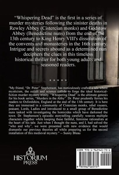 "Whispering Dead" is the first in a series of murder mysteries following the sinister deaths in Rewley Abbey (Cistercian monks) and Godstow Abbey (Benedictine nuns) from the end of the 13th century to King Henry VIII's dissolution of the convents and monasteries in the 16th century. Intrigue and secrets abound as a determined nun deciphers the clues in this timeless historical thriller for both young adults and seasoned readers. * * * * * "My friend, "Dr. Peter" Stephenson, has meticulously crafted a tale where mysticism, the occult and science collide to forge the ideal historical-fiction murder mystery trinity. "Whispering Dead" is the ultimate genesis for his book series, "Murders in the Abby". Dr. Peter prudently ferries his readers to Oxfordshire, England at the end of the 13th century. It is here they are immersed in a community of Cistercian monks, rebel rousers, peasant, Lords, Ladies and introduced to a small group of Benedictine nuns tasked with investigating the homicides which have darkened the town. Dr. Stephenson's episodic storytelling carefully weaves multiple characters together while keeping these faithful, feminine rationalists at the heart of his tale. Just when I thought the nuns, and I, had solved the "who and why", we were presented with new evidence that would dismantle our previous theories all while preparing us for the second installation of this medieval mystery." -- Sunny Bleau