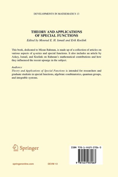 This volume, "Theory and Applications of Special Functions," is d- icated to Mizan Rahman in honoring him for the many important c- tributions to the theory of special functions that he has made over the years, and still continues to make. Some of the papers were presented at a special session of the American Mathematical Society Annual Meeting in Baltimore, Maryland, in January 2003 organized by Mourad Ismail. Mizan Rahman's contributions are not only contained in his own - pers, but also indirectly in other papers for which he supplied useful and often essential information. We refer to the paper on his mathematics in this volume for more information. This paper contains some personal recollections and tries to describe Mizan Rahman's literary writings in his mother tongue, Bengali. An even more personal paper on Mizan Rahman is the letter by his sons, whom we thank for allowing us to reproduce it in this book. The theory of special functions is very much an application driven field of mathematics. This is a very old field, dating back to the 18th century when physicists and mathematician were looking for solutions of the fundamental differential equations of mathematical physics. Since then the field has grown enormously, and this book reflects only part of the known applications.
