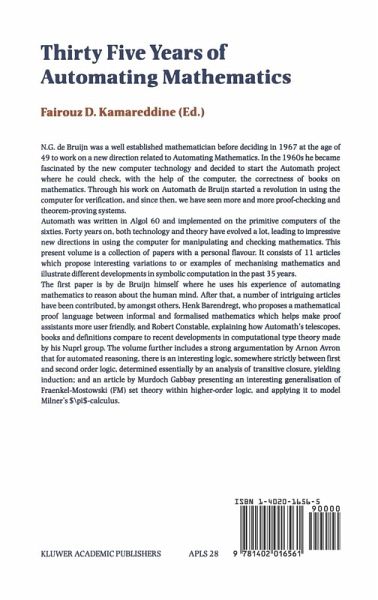THIRTY FIVE YEARS OF AUTOMATING MATHEMATICS: DEDICATED TO 35 YEARS OF DE BRUIJN'S AUTOMATH N. G. de Bruijn was a well established mathematician before deciding in 1967 at the age of 49 to work on a new direction related to Automating Mathematics. By then, his contributions in mathematics were numerous and extremely influential. His book on advanced asymptotic methods, North Holland 1958, was a classic and was subsequently turned into a book in the well known Dover book series. His work on combinatorics yielded influential notions and theorems of which we mention the de Bruijn-sequences of 1946 and the de Bruijn-Erdos theorem of 1948. De Bruijn's contributions to mathematics also included his work on generalized function theory, analytic number theory, optimal control, quasicrystals, the mathematical analysis of games and much more. In the 1960s de Bruijn became fascinated by the new computer technology and as a result, decided to start the new AUTOMATH project where he could check, with the help of the computer, the correctness of books of mathematics. In each area that de Bruijn approached, he shed a new light and was known for his originality and for making deep intellectual contributions. And when it came to automating mathematics, he again did it his way and introduced the highly influential AUTOMATH. In the past decade he has also been working on theories of the human brain.