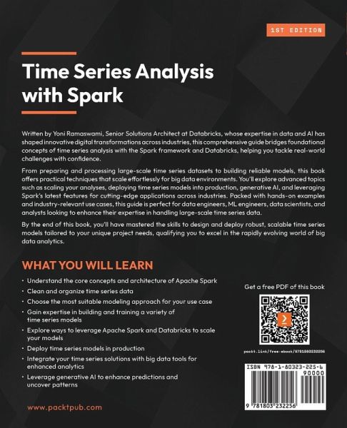 Master the fundamentals of time series analysis with Apache Spark and Databricks and uncover actionable insights at scale Key Features: - Quickly get started with your first models and explore the potential of Generative AI - Learn how to use Apache Spark and Databricks for scalable time series solutions - Establish best practices to ensure success from development to production and beyond - Purchase of the print or Kindle book includes a free PDF eBook Book Description: Written by Databricks Senior Solutions Architect Yoni Ramaswami, whose expertise in Data and AI has shaped innovative digital transformations across industries, this comprehensive guide bridges foundational concepts of time series analysis with the Spark framework and Databricks, preparing you to tackle real-world challenges with confidence. From preparing and processing large-scale time series datasets to building reliable models, this book offers practical techniques that scale effortlessly for big data environments. You'll explore advanced topics such as scaling your analyses, deploying time series models into production, Generative AI, and leveraging Spark's latest features for cutting-edge applications across industries. Packed with hands-on examples and industry-relevant use cases, this guide is perfect for data engineers, ML engineers, data scientists, and analysts looking to enhance their expertise in handling large-scale time series data. By the end of this book, you'll have mastered the skills to design and deploy robust, scalable time series models tailored to your unique project needs-qualifying you to excel in the rapidly evolving world of big data analytics. What You Will Learn: - Understand the core concepts and architectures of Apache Spark - Clean and organize time series data - Choose the most suitable modeling approach for your use case - Gain expertise in building and training a variety of time series models - Explore ways to leverage Apache Spark and Databricks to scale your models - Deploy time series models in production - Integrate your time series solutions with big data tools for enhanced analytics - Leverage GenAI to enhance predictions and uncover patterns Who this book is for: If you are a data engineer, ML engineer, data scientist, or analyst looking to enhance your skills in time series analysis with Apache Spark and Databricks, this book is for you. Whether you're new to time series or an experienced practitioner, this guide provides valuable insights and techniques to improve your data processing capabilities. A basic understanding of Apache Spark is helpful, but no prior experience with time series analysis is required. Table of Contents - What Are Time Series - Why Time Series Analysis? - Introduction to Apache Spark - End-to-End View of a Time Series Analysis Project - Data Preparation - Exploratory Data Analysis - Building and Testing Models - Going at Scale - Going to Production - Going Further with Apache Spark - Recent Developments in Time Series Analysis