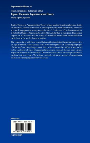 Topical Themes in Argumentation Theory brings together twenty exploratory studies on important subjects of research in contemporary argumentation theory. The essays are based on papers that were presented at the 7th Conference of the International Society for the Study of Argumentation (ISSA) in Amsterdam in June 2010. They give an impression of the nature and the variety of the kind of research that has recently been carried out in the study of argumentation.