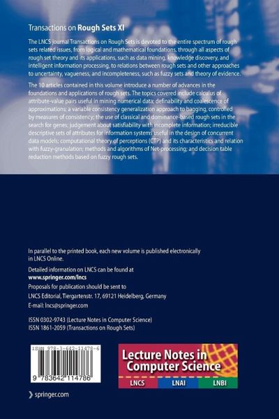 Volume XI of the Transactions on Rough Sets (TRS) provides evidence of f- ther growth in the rough set landscape, both in terms of its foundations and applications. This volume provides further evidence of the number of research streams that were either directly or indirectly initiated by the seminal work on rough 1 sets by Zdzis law Pawlak (1926-2006) . Evidence of the growth of various rough 2 set-based research streams can be found in the rough set database . Thisvolumecontainsarticlesintroducingadvancesinthefoundationsand- plicationsofroughsets.These advancesinclude: calculusofattribute-va...