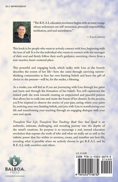 "The R.E.A.L education revolution begins with an inner voyage whose milestones are self-awareness, personal responsibility, meditation, and soul assimilation."- Lisa Carberry This book is for people who want to actively connect with love, beginning with the love of self. It is for the individual who wants to connect with the messages of their soul and firmly follow their soul's guidance, exercising choice from a non-reactive, heart-centered place. This powerful and engaging book, which walks with Lisa as she bravely describes the events of her life-how she came through surviving narrow thinking communities to face her own limiting beliefs and learn the gift of choice in the present-will be, for the reader, a blessing. As a reader, you will feel as if you are journeying with Lisa through her pains and hurts and through the formation of her beliefs. You will experience the inward path she took towards creating an empowered and peaceful present that allows her to walk into and create the future of her dreams. In the process, you'll be inspired to observe the stories of your past, seeing where your pains lie, noticing your own limiting beliefs, and join with Lisa in transforming your life and transforming your teaching through an engaging dialogue with your own soul speak. Transform Your Life, Transform Your Teaching: Book One: Soul Speak is an authentic, intimate, challenging, and revealing journey into the depths of the mind's creations. Its purpose is to encourage a real, inward education revolution that exposes the truth of who and what we really are as well as the infinite power that lies within to envision, create, and manifest our best life, revealing what is possible when we actively choose to get R.E.A.L and be R.E.A.L with ourselves and others.