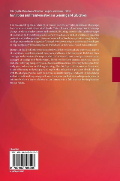 The first of this book's three sections deals with the conceptual and theoretical aspects of transition, transformational processes and human development. It defines these concepts and examines the ways in which educational theory and praxis understand concepts of change and development. The second section presents empirical studies that offer differing perspectives on educational transitions, covering the lifespan from earlyyears education to lifelong learning. The third part of the volume focuses on issues of learning and pedagogy and argues that educational practices should change with the changing world. With numerous concrete examples included in the analysis, and with studies taking a range of forms from personal histories to large-scale surveys, this new book is a major addition to the literature in a field that has key implications for our future.