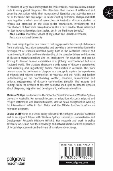This book brings together new research that engages with the concept of diaspora from a uniquely Australian perspective and provides a timely contribution to the development of research-informed policy, both in the Australian context and more broadly. It builds on the understanding of the complex drivers and domains of diaspora transnationalism and its implications for countries and people striving to develop human capabilities in a globally interconnected but also fractured world. The chapters showcase a wide range of diaspora experiences from culturally and linguistically diverse communities in Australia. This work demonstrates the usefulness of diaspora as a concept to explore the experiences of migrant and refugee communities in Australia and the Pacific and further understanding on the peacebuilding, conflict, economic, humanitarian and political engagements of diaspora communities globally. The insights and findings from the breadth of research featured shed light on broader debates about diasporas, migration and development, and transnationalism.