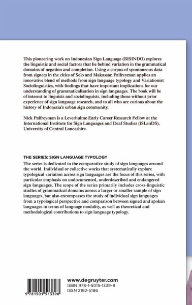 This pioneering work on Indonesian Sign Language (BISINDO) explores the linguistic and social factors that lie behind variation in the grammatical domains of negation and completion. Using a corpus of spontaneous data from signers in the cities of Solo and Makassar, Palfreyman applies an innovative blend of methods from sign language typology and Variationist Sociolinguistics, with findings that have important implications for our understanding of grammaticalisation in sign languages. The book will be of interest to linguists and sociolinguists, including those without prior experience of sign language research, and to all who are curious about the history of Indonesia's urban sign community.