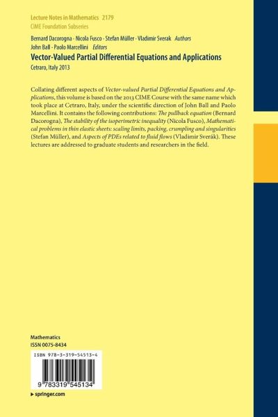 Collating different aspects of Vector-valued Partial Differential Equations and Applications, this volume is based on the 2013 CIME Course with the same name which took place at Cetraro, Italy, under the scientific direction of John Ball and Paolo Marcellini. It contains the following contributions: The pullback equation (Bernard Dacorogna), The stability of the isoperimetric inequality (Nicola Fusco), Mathematical problems in thin elastic sheets: scaling limits, packing, crumpling and singularities (Stefan Müller), and Aspects of PDEs related to fluid flows (Vladimir Sverák). These lectures are addressed to graduate students and researchers in the field.
