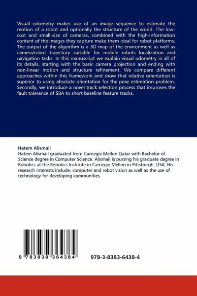 Visual odometry makes use of an image sequence to estimate the motion of a robot and optionally the structure of the world. The low-cost and small-size of cameras, combined with the high-information content of the images they capture make them ideal for robot platforms. The output of the algorithm is a 3D map of the environment as well as camera/robot trajectory suitable for mobile robots localization and navigation tasks. In this manuscript we explain visual odometry in all of its details, starting with the basic camera projection and ending with non-linear motion and structure refinement. We compare different approaches within this framework and show that relative orientation is superior to using absolute orientation for the pose estimation problem. Secondly, we introduce a novel track selection process that improves the fault tolerance of SBA to short baseline feature tracks.