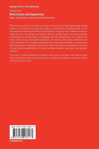 This book provides an essential overview of wind science and engineering, taking readers on a journey through the origins, developments, fundamentals, recent advancements and latest trends in this broad field. Along the way, it addresses a diverse range of topics, including: atmospheric physics; meteorology; micrometeorology; climatology; the aerodynamics of buildings, aircraft, sailing boats, road vehicles and trains; wind energy; atmospheric pollution; soil erosion; snow drift, windbreaks and crops; bioclimatic city-planning and architecture; wind actions and effects on structures; and wind hazards, vulnerability and risk. In order to provide a comprehensive overview of wind and its manifold effects, the book combines scientific, descriptive and narrative chapters.