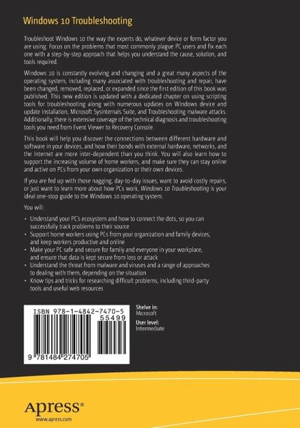 Windows 10 is constantly evolving and changing and a great many aspects of the operating system, including many associated with troubleshooting and repair, have been changed, removed, replaced, or expanded since the first edition of this book was published. This new edition is updated with a dedicated chapter on using scripting tools for troubleshooting along with numerous updates on Windows device and update installation, Microsoft Sysinternals Suite, and Troubleshooting malware attacks. Additionally, there is extensive coverage of the technical diagnosis and troubleshooting tools you need from Event Viewer to Recovery Console.