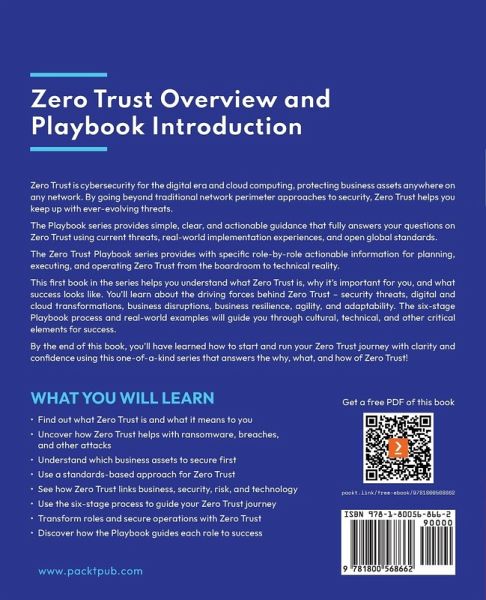 Enhance your cybersecurity and agility with this thorough playbook, featuring actionable guidance, insights, and success criteria from industry expertsKey FeaturesGet simple, clear, and practical advice for everyone from CEOs to security operations Organize your Zero Trust journey into role-by-role execution stages Integrate real-world implementation experience with global Zero Trust standards Purchase of the print or Kindle book includes a free eBook in the PDF format Book Description Zero Trust is cybersecurity for the digital era and cloud computing, protecting business assets anywhere on any network. By going beyond traditional network perimeter approaches to security, Zero Trust helps you keep up with ever-evolving threats. The playbook series provides simple, clear, and actionable guidance that fully answers your questions on Zero Trust using current threats, real-world implementation experiences, and open global standards. The Zero Trust playbook series guides you with specific role-by-role actionable information for planning, executing, and operating Zero Trust from the boardroom to technical reality. This first book in the series helps you understand what Zero Trust is, why it's important for you, and what success looks like. You'll learn about the driving forces behind Zero Trust - security threats, digital and cloud transformations, business disruptions, business resilience, agility, and adaptability. The six-stage playbook process and real-world examples will guide you through cultural, technical, and other critical elements for success. By the end of this book, you'll have understood how to start and run your Zero Trust journey with clarity and confidence using this one-of-a-kind series that answers the why, what, and how of Zero Trust!What you will learnFind out what Zero Trust is and what it means to you Uncover how Zero Trust helps with ransomware, breaches, and other attacks Understand which business assets to secure first Use a standards-based approach for Zero Trust See how Zero Trust links business, security, risk, and technology Use the six-stage process to guide your Zero Trust journey Transform roles and secure operations with Zero Trust Discover how the playbook guides each role to success Who this book is for Whether you're a business leader, security practitioner, or technology executive, this comprehensive guide to Zero Trust has something for you. This book provides practical guidance for implementing and managing a Zero Trust strategy and its impact on every role (including yours!). This is the go-to guide for everyone including board members, CEOs, CIOs, CISOs, architects, engineers, IT admins, security analysts, program managers, product owners, developers, and managers. Don't miss out on this essential resource for securing your organization against cyber threats.Table of ContentsZero Trust - This Is the Way Reading the Zero Trust Playbook Series Zero Trust is Security for Today's World Standard Zero Trust Capabilities Artificial Intelligence (AI) and Zero Trust How to Scope, Size, and Start Zero Trust What Zero Trust Success Looks Like Adoption with the Three-Pillar Model The Zero Trust Six-Stage Plan Zero Trust Playbook Roles