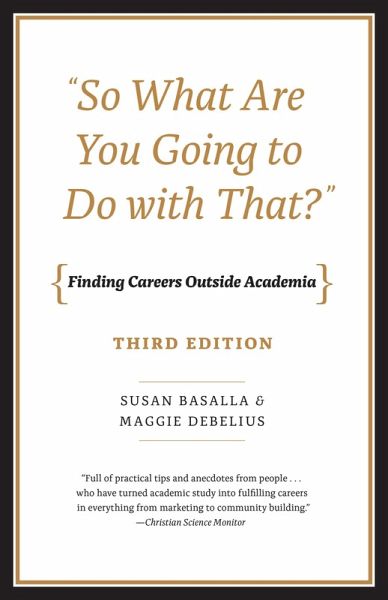 Graduate schools churn out tens of thousands of PhDs and MAs every year. Yet more than half of all college courses are taught by adjunct faculty, which means that the chances of an academic landing a tenure-track job seem only to shrink as student loan and credit card debts grow. What's a frustrated would-be scholar to do? Can she really leave academia? Can a job outside the academy really be rewarding? And could anyone want to hire a grad-school refugee? In this third edition of "So What Are You Going to Do with That?", thoroughly revised with new advice for students in the sciences, Susan Basalla and Maggie Debelius-PhDs themselves-answer all those questions with a resounding "Yes!" A witty, accessible guide full of concrete advice for anyone contemplating the jump from scholarship to the outside world, " So What Are You Going to Do with That?" covers topics ranging from career counseling to interview etiquette to how to translate skills learned in the academy into terms an employer can understand and appreciate. Packed with examples and stories from real people who have successfully made this daunting-but potentially rewarding-transition, and written with a deep understanding of both the joys and difficulties of the academic life, this fully updated guide will be indispensable for any graduate student or professor who has ever glanced at his or her CV, flipped through the want ads, and wondered, "What if?"