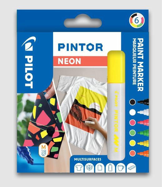 Kreativmarker PINTOR 6er Set "Neon". Geeignet für kreative Zwecke, egal ob für Profis oder Hobbykünstler. Markiert, schreibt, zeichnet und malt in 30 Farben. Mit pigmentierter, geruchsarmer Tinte auf Wasserbasis. Gut deckende, schnell trocknende Tinte. Lichtdurchlässig.