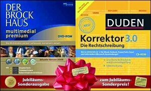 200 Jahre Brockhaus und 125 Jahre Duden - wenn das kein Grund zum Feiern ist. In diesem Jubelpaket sind die meistverkauften elektronischen Produkte dieser Marken zusammengestellt! Der "Brockhaus multimedial 200 premium" auf DVD-ROM lässt keine Wünsche offen, wenn es ums Nachschlagen direkt am Computer geht - umfassende Informationen, professionell aufbereitet, perfekt recherchierbar und mit jeder Menge Multimedia. Der "Duden Korrektor 3.0" auf CD-ROM verbessert die Texterfassung und -verarbeitung in allen Anwendungen von Microsoft Office und Works. BROCKHAUS MM 2005 PREMIUM DVD-ROM: Mit 240.000 Artikeln, 315.000 Stichwörtern und 17 Mio. Wörtern eines der umfassendsten Lexika am Markt + NEU: Mehr als 10.000 Wörter werden vorgelesen + NEU: Alle Informationen zu einem Thema im Themenbildschirm + NEU: Die Themenstatistik zeigt, welche Wissensgebiete am meisten genutzt werden und führt thematisch weiter + NEU: Das Länderpuzzle testet spielerisch die Geografiekenntnisse + NEU: Der dynamische Bildschirmschoner zeigt Bilder aus den zuletzt besuchten Artikeln / DUDEN KORREKTOR 3.0 CD-ROM: Integriert sich nahtlos in die Anwendungen von MS Office und MS Works + Verbesserte Rechtschreib- und Grammatikprüfung + Stilprüfung + Vier Prüfstile: "Duden-Standard nach Kompaktwörterbuch" neben progressiv, konservativ und tolerant + Auswahlmöglichkeit zwischen Schnellprüfmodus (Erkennung der häufigsten Fehler) und Vollprüfmodus.