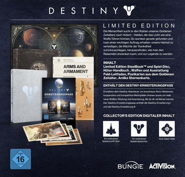 - Erweitere dein Destiny-Abenteuer um brandneue Story-Missionen, kooperative und kompetitive Mehrspieler-Arenen sowie um viele neue Waffen, Rüstung und Ausrüstung, die du dir verdienen kannst. Der Destiny-Erweiterungspass enthält die Destiny-Erweiterung I und die Destiny-Erweiterung II.