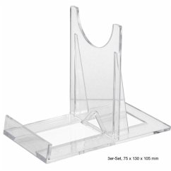 Aus transparentem Kunsstoff. Der senkrechte Teil des Ständers kann je nach Ausstellungsstück verschoben werden.