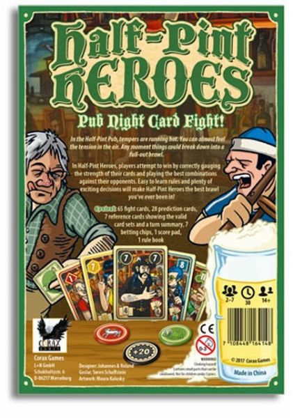 ACHTUNG: Das Spiel ist komplett Englisch.Die zivilisierte Art, eure nächste Kneipenschlägerei auszutragen! Oder einfach jede Menge Spaß zu haben!Half-Pint Heroes entführt euch in einen gemütlichen Pub, in dem die Gemüter kurz vor dem Überkochen sind. Obwohl viele der Gäste gerade erst ein halbes Bierchen intus haben, sind sie sicher, es mit jedem hier drin aufnehmen zu können. Also zieht euch warm an, nehmt Platz und schon kann es losgehen! Half-Pint Heroes ist ein Stichspiel der besonders spaßigen Art, in dem 2-7 Gelegenheits- oder Kennerspieler ab 9 Jahren sich ihre Köpfe zerbrech...