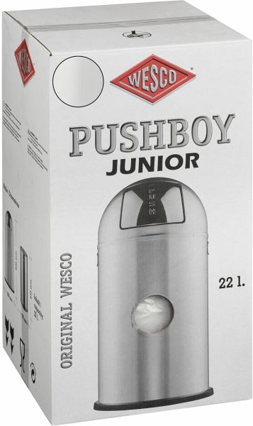 Mülleimer Wesco Pushboy JuniorDieser stilvolle Mülleimer passt ideal in kleinere Büros oder Haushalte. Dank der großen Klappe aus Edelstahl bleiben Gerüche zuverlässig eingeschlossen.Praktisch für jedes BüroDer stabile Kunststoffring an der Unterseite schützt den Boden. Im Inneren befindet sich ein Metalleinsatz, der das Entleeren erleichtert.Eigenschaften:Geruchsdichte Klappe aus EdelstahlInnenliegender Metalleinsatz für einfaches LeerenStabiler Kunststoffring schützt den Boden vor KratzernKompakte Größe für kleinere RäumeVolumen: 22 LiterAbmessungen (BxHxT): 35 x 63 x 35 cm